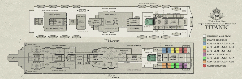 Titanic deck plans with cabin numbers.